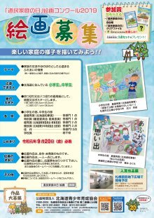 「明るい家庭づくり道民運動」の一環として制定した「道民家庭の日」(毎月第3日曜日)が今年20年目を迎え、より一層の普及啓発を図るため、今年度も「道民家庭の日」絵画コンクール2019を実施することとなり、 全道の小・中学生の皆さんから、家族の交流やほのぼのとした心温まるふれあいの情景をテーマにした作品を募集しています。