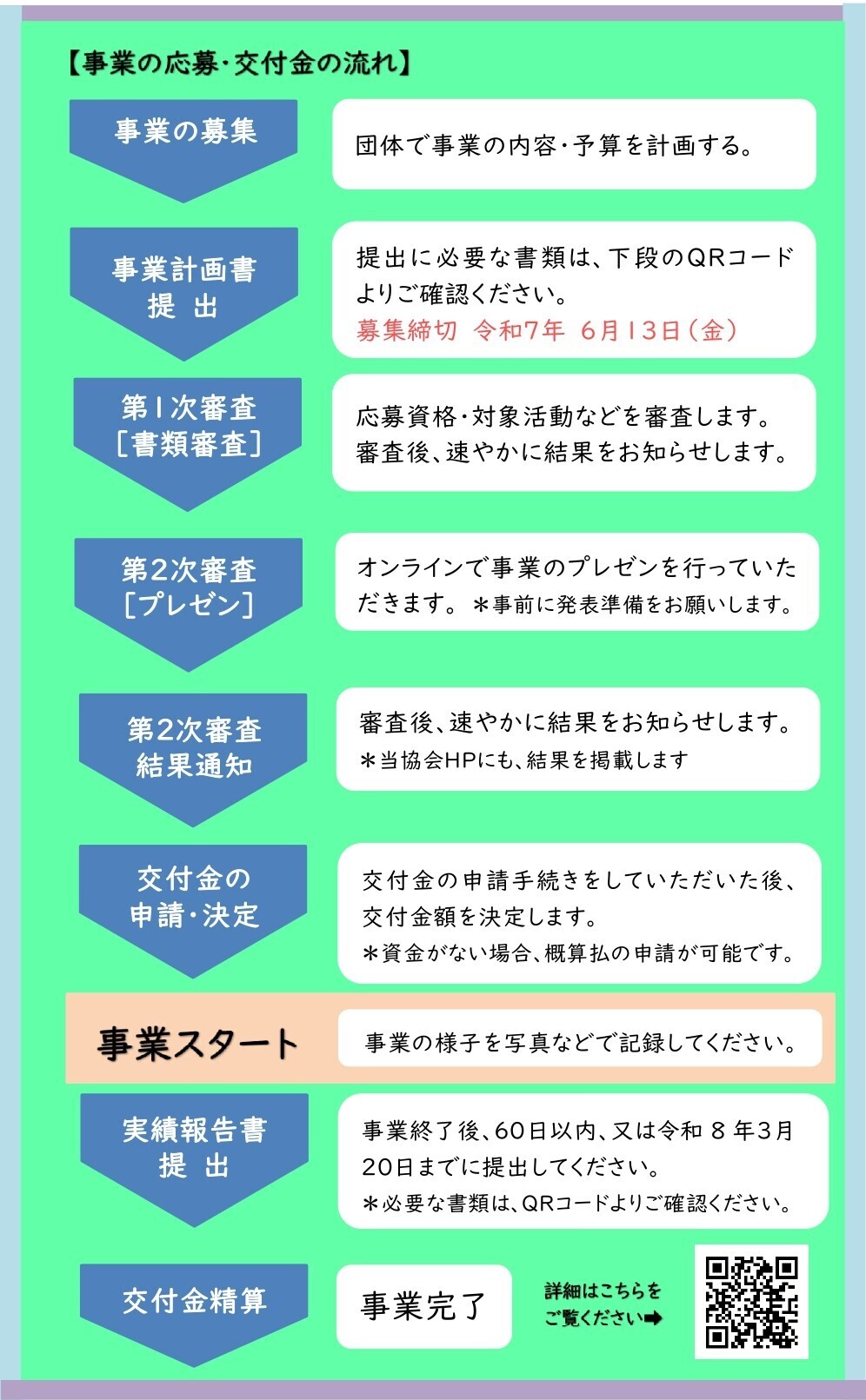 令和7年6月13日(金) までに、当協会に事業計画書等を提出してください。