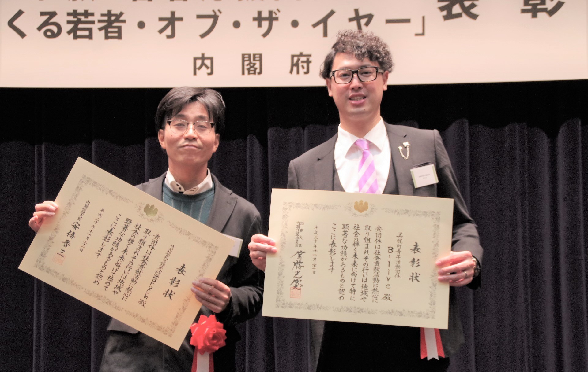 平成30年度は、各都道府県等から推薦のあった中から有識者等で構成される選考委員会により、内閣総理大臣表彰を『特定非営利活動法人ezo rock』(札幌市)が、また、内閣府特命担当大臣表彰を『美幌町青年活動団体B-live』(美幌町)が受賞し、先月11月21日、内閣府講堂(東京都)で開催された表彰式において表彰されました。